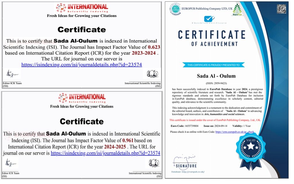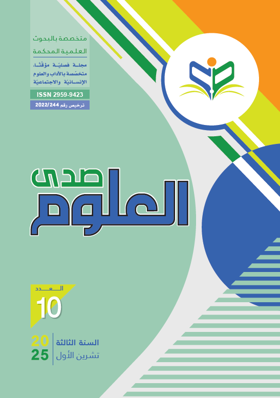 في مجلة صدى العلوم، نؤمن بأن المعرفة هي الأساس الذي يُبنى عليه التقدم. نحن مجلة علمية محكّمة متخصصة في نشر الأبحاث والدراسات الأكاديمية الرصينة في مختلف المجالات العلمية. نسعى إلى توفير منصة موثوقة للباحثين والمفكرين لمشاركة أفكارهم واكتشافاتهم مع المجتمع العلمي، وفقًا لأعلى معايير النزاهة والأصالة. من خلال التزامنا بالتحكيم الدقيق والجودة البحثية، نطمح إلى أن نكون جسراً يربط بين الباحثين والقراء، ويسهم في تطوير العلوم والمعرفة لخدمة الإنسانية.